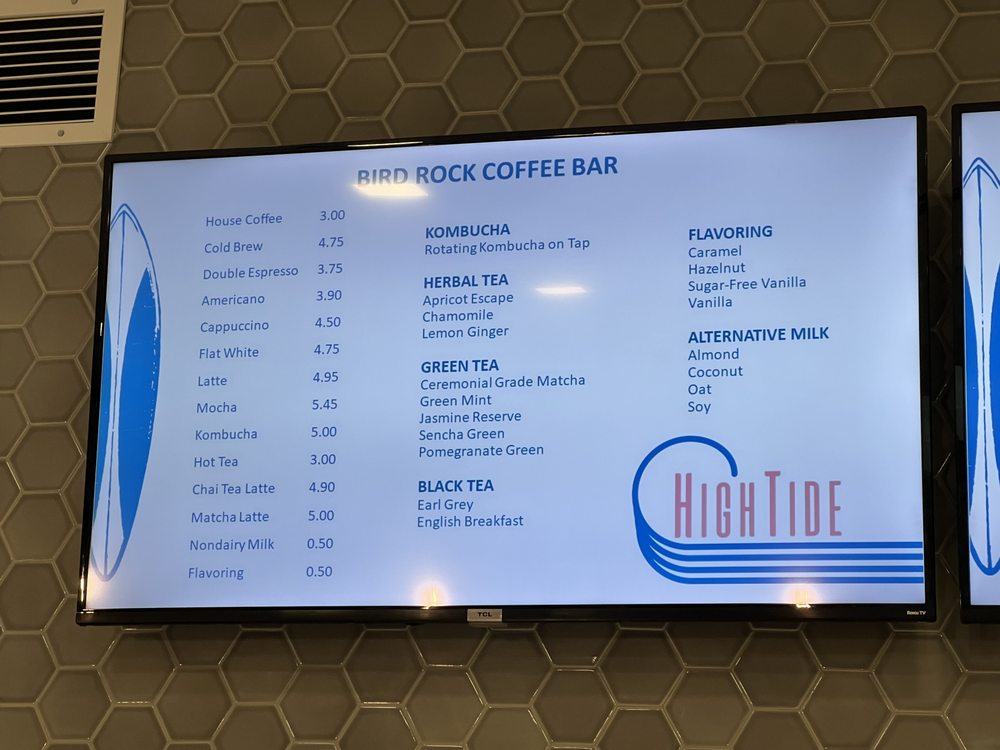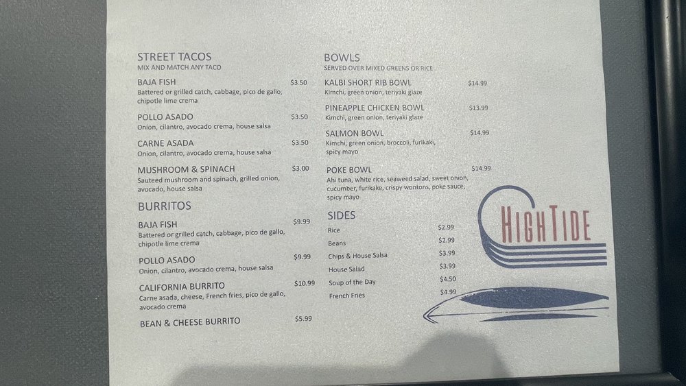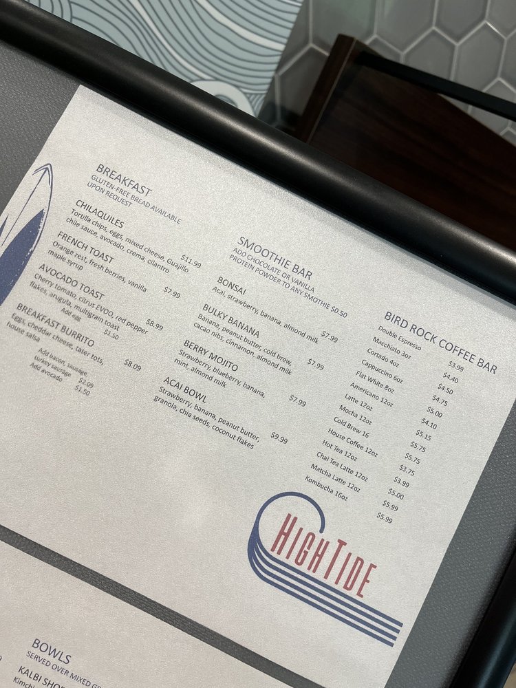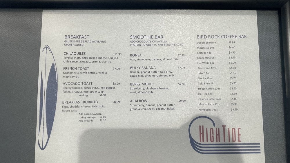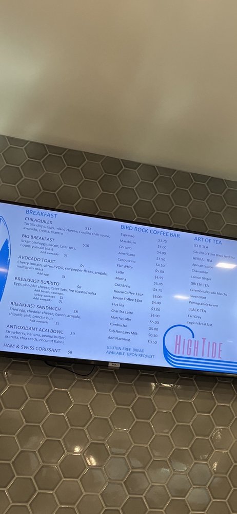 Welcome to High Tide Cafe, a delightful spot nestled in La Jolla, CA, perfect for anyone seeking a fresh, flavorful meal. The menu shines with a variety of offerings that cater to every palate. You can sink your teeth into the Bacon Jam Flatbread or savor the unique Parmesan Truffle Fries during their enticing happy hour. For heartier fare, patrons rave about the remarkable breakfast options and the mouthwatering burritos.